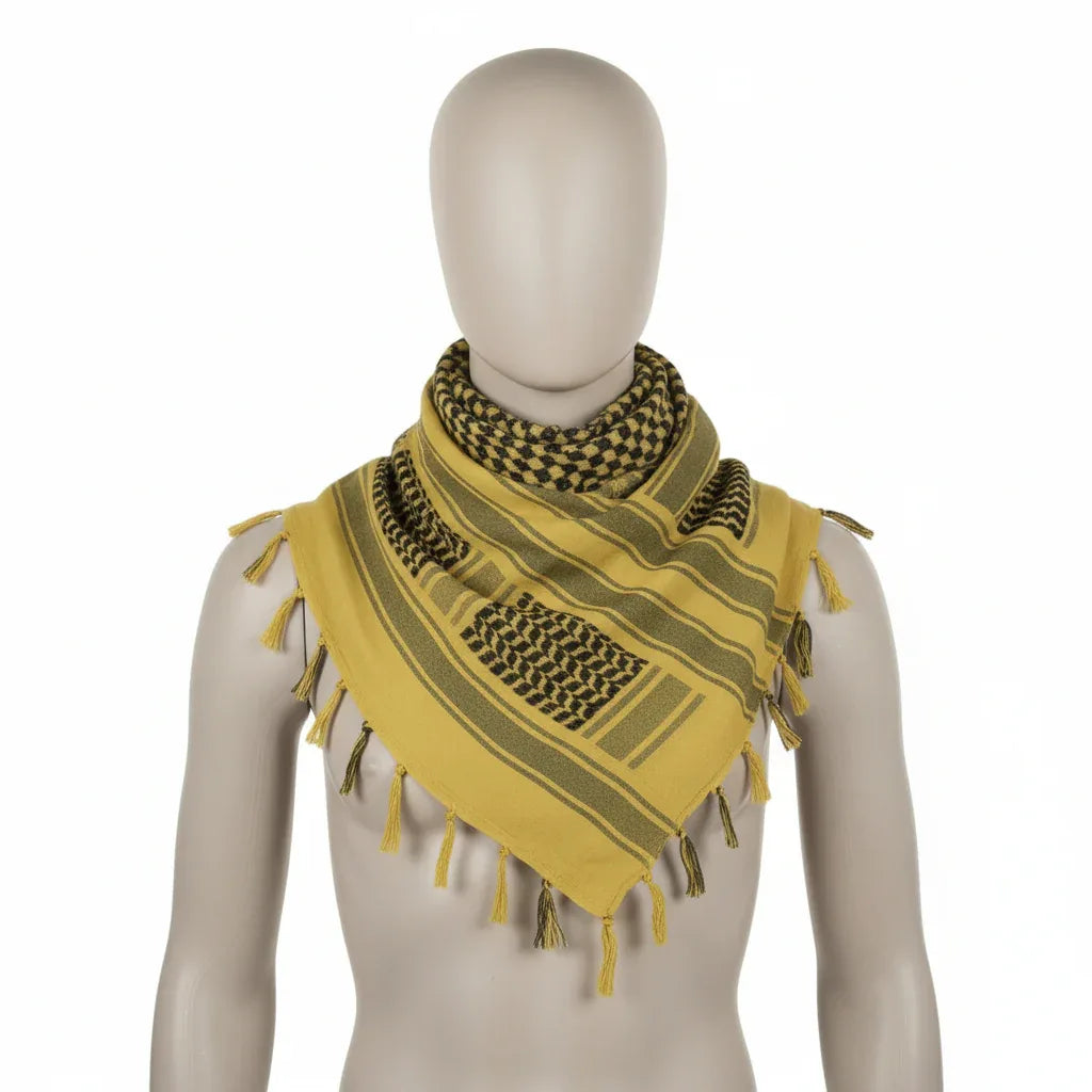 Imagine yourself deep in the jungle, sweat beading on your forehead, the scorching sun blinding you, and the heat suffocating. Your yellow and black keffiyeh is there, within easy reach, ready to protect you and give you the edge you need to survive.